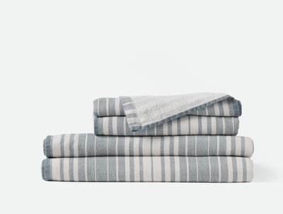 The Sycamore Organic Cotton Linen Towels are crafted from a gentle, skin-friendly blend of organic cotton and linen that gets softer over time. They feature a textured flat face with vertical ombre stripes and a plush terry back for enhanced absorbency and comfort. Designed to complement a variety of color palettes, they bring versatility and vibrancy to any bathroom.